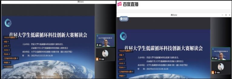 6月15日,首届大学生低碳循环科技创新大赛解读会通过腾讯会议、百度直播、微博直播等平台进行同步线上直播。此次大赛解读会由首届大学生低碳循环科技创新大赛组委会、首届浙江省大学生低碳循环科技创新大赛组委会主办,由大学生低碳循环科技创新大赛秘书处浙江科技学院承办。中国绿发会和浙江省绿色科技文化促进会为解读会提供同步转播。