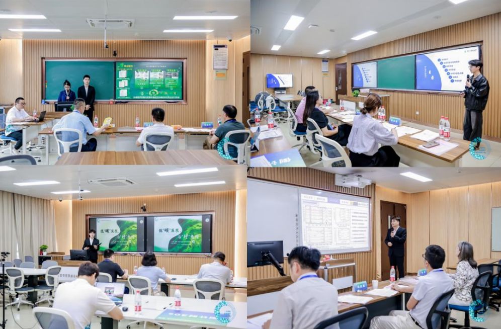 根据大赛安排,参赛选手分为四组进行答辩评审。来自浙江大学、浙江省生态环境厅、北控水务集团等高校、企业的 12 位专家担任评委。参赛选手展示了各自优秀的创新成果,如来自浙江大学的杨沛霖团队以柑橘全资源化利用为核心,通过创新工艺将废弃物转化为高附加值产品,实现“零废弃”生产闭环;浙江科技大学刘鹏程团队通过为天然气发动机尾气排放治理提供低碳高效的新技术来实现绿色低碳发展;浙江工业大学潘荣锴团队致力于制定公众参与污染治理的政策,为环保部门提供新思路。