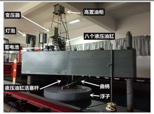 目前而言,我国研发的波浪能发电装置大多处于跟跑阶段,很多波浪发电示范工程普遍存在运行效果不佳,装置可靠性、稳定性有待提高等问题。很多波浪发电示范工程前期工作当中的理论分析与数值模拟结果都做的相当不错,但在现实海况中却问题不断,难以达到预定的项目指标。造成这种现象的原因当中很大一部分是对实际海况的认识不足,过于片面追求理论效果而忽视实际效果;在前期准备过程中,很多装置在理论分析与数值模拟当中普遍采用所在海域的有义波高、平均波高或最大波高进行分析,结果出现有些装置一年当只有几个月可以正常工作,其余时间都处于不工作或低效率工作状态。因此,为解决这些难题实现装置 24 小时全天候稳定发电,项目以最常见的小波浪为研究对象,设计了一种即使在小波高下也能高效、稳定发电的新型摆式波浪能发电装置。装置通过三级转换机构实现波浪能量连续稳定发电:第一级通过浮子随波运动,完成波浪能向机械能的转换;第二级通过波浪齿条与群组油缸啮合,完成机械能向液压能的转换;第三级通过液压能存储、控制调节与液压马达恒速驱动发电机旋转,完成液压能向电能的转换。为获取该装置在小波高下的性能表现,对装置进行了充分的验证。